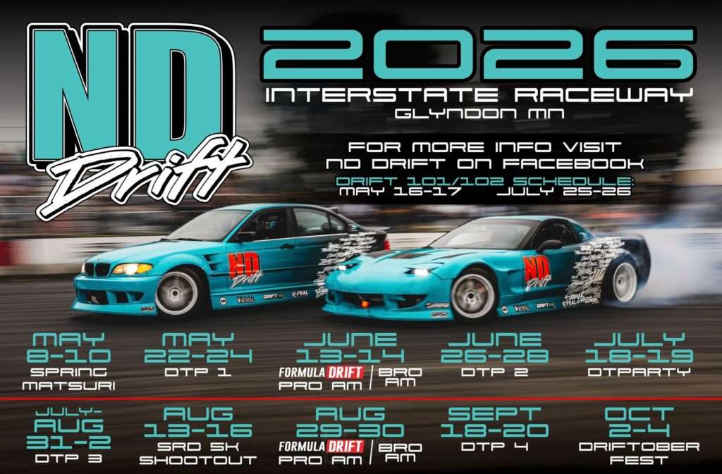 While the great plains are frosted over and the winter wind is howling outside, we’ve been working on polishing up our 2026 schedule. Mark your calendars for the next year to catch all the ND Drift events at Interstate Raceway.